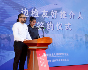 9月17日,溫州機場出入境邊防檢查站舉行“邊檢友好推介人”簽約儀式,溫州和平國際醫院醫生豪孟德Hamad Abdul Zahir、蘇瑪Sumayyah Hosany夫婦受邀擔任該站“邊檢友好推介人”,頒發榮譽聘書,夫婦二人今后將參與到該站外國旅客出入境政策解讀宣講、出入境注意事項指引等工作中。