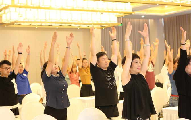 黃鵬現(xiàn)場示范脊柱日常恢復(fù)四步操,教會大家“世界上最正確的站立和行走”,全場站立做操。