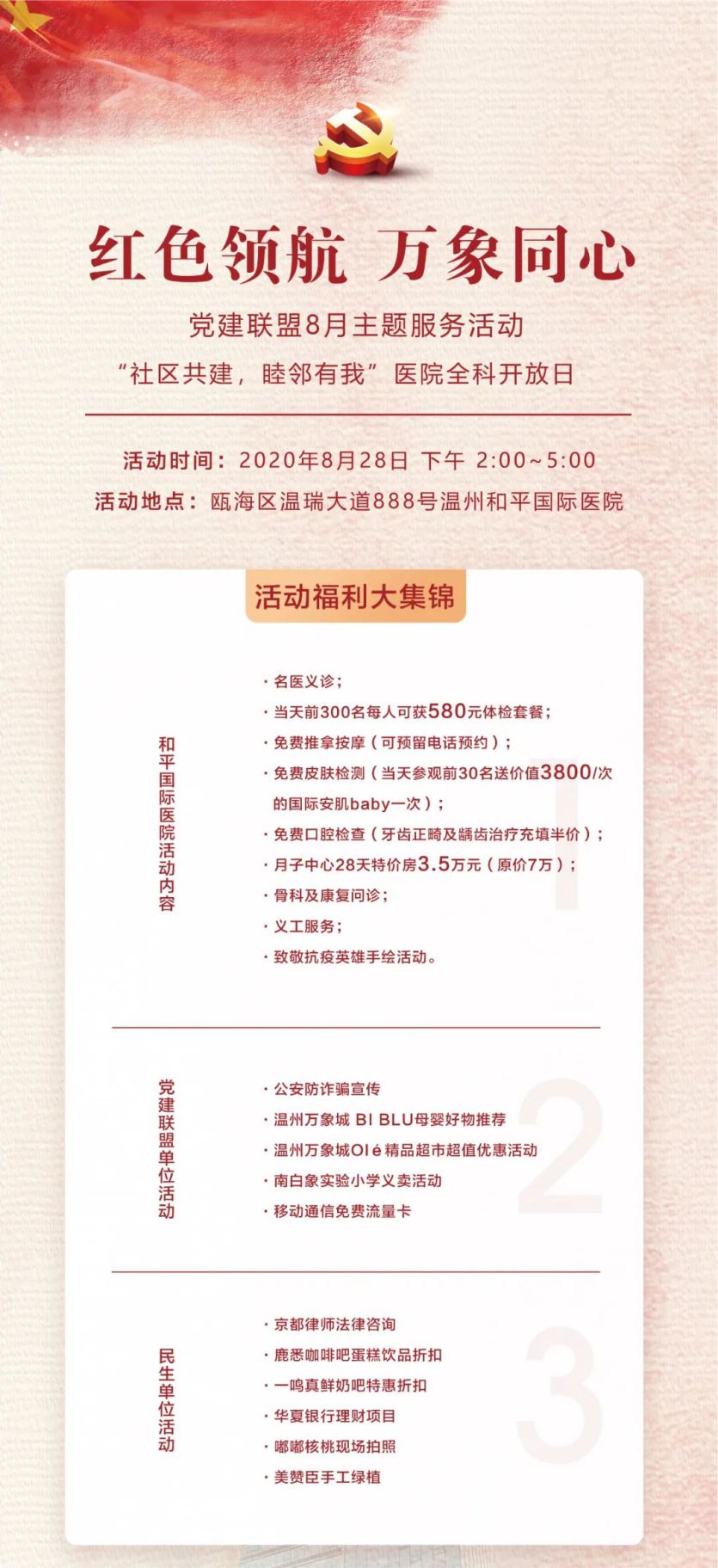 8月28日,甌海區南白象街道“紅色領航 萬象同心”黨建聯盟聯合多方力量,將在和平國際醫院舉行全科開放日活動,現場有近20家黨建聯盟單位及愛心商家,共計提供30多項福利,寓教于樂,縱享精彩。