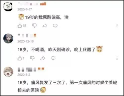 類似像郭麒麟一樣,十幾、二十多歲發生痛風的,也不在少數。《痛風748例臨床特征分析》提到,2008-2013年,青年患者所占比例逐年上升,分別為 39% 、39. 4% 、40% 、42% 、48% 、52% ,甚至超過了中老年患者。②