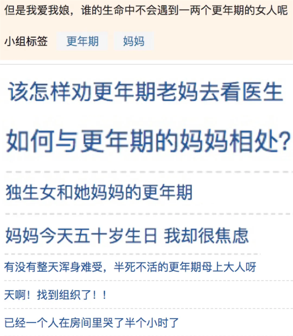 在網上搜索“媽媽更年期,我該怎么辦時”,發現一個名為“媽媽正在更年期”的討論小組,那里大家邊“吐槽”老媽的更年期離譜行為邊共享如何與更年期老媽相處。