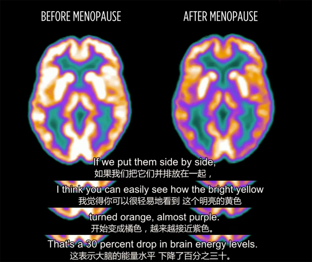一位女性更年期前后的腦部掃描對比圖,說明了這一點。更年期后的掃描圖顯示,她的大腦比八年前降低了30%的活力。