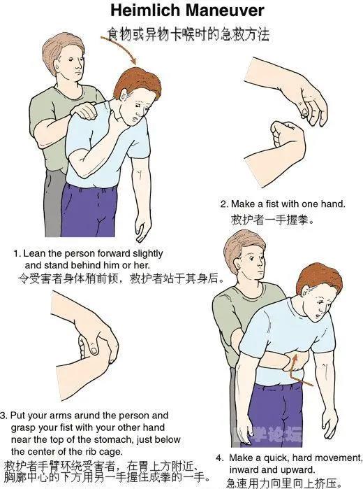 可采用上述用于成人4個(gè)步驟的②③④三點(diǎn),或稍稍彎下腰去,靠在一固定的水平物體上(如桌子邊緣、椅背、扶手欄桿等),以物體邊緣壓迫上腹部,快速向上沖擊。重復(fù)之,直至異物排出。