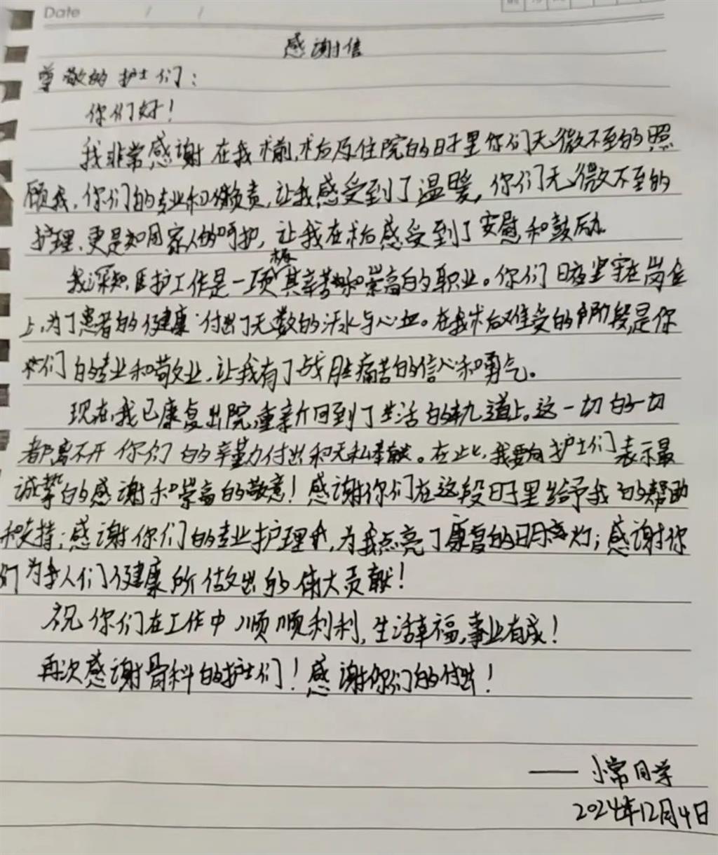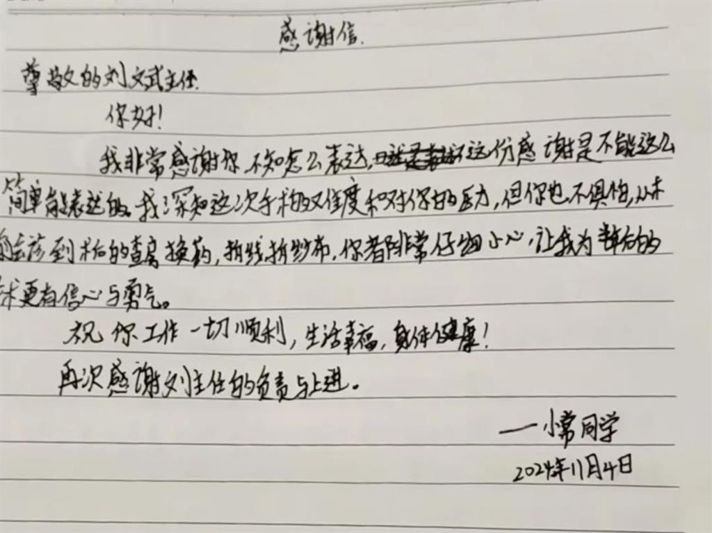 12月4日,經(jīng)過18天的術后治療與觀察,MDT專家團隊多方面評估,初晨術后恢復良好,可以出院。出院時,初晨親筆寫下兩封感謝信,交給了醫(yī)院整形外科主任劉斌和創(chuàng)傷與創(chuàng)面修復科的護士們。紙短情長,字里行間流露的真情打動了每一個人。
