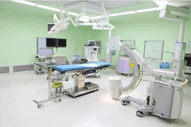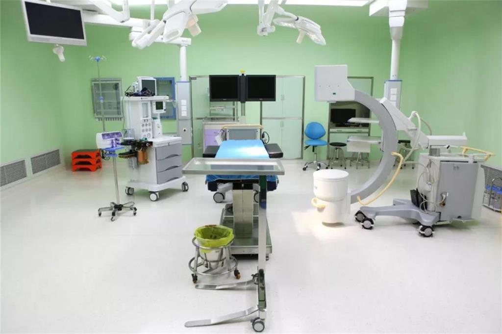 如上圖所示,手術室面積大,配備也相當“豪華”,除了有進口的C臂、手術床、無影燈、麻醉機,還有內(nèi)嵌式恒溫箱,就連地上鋪的地板墻壁上的材料也都是防輻射的。